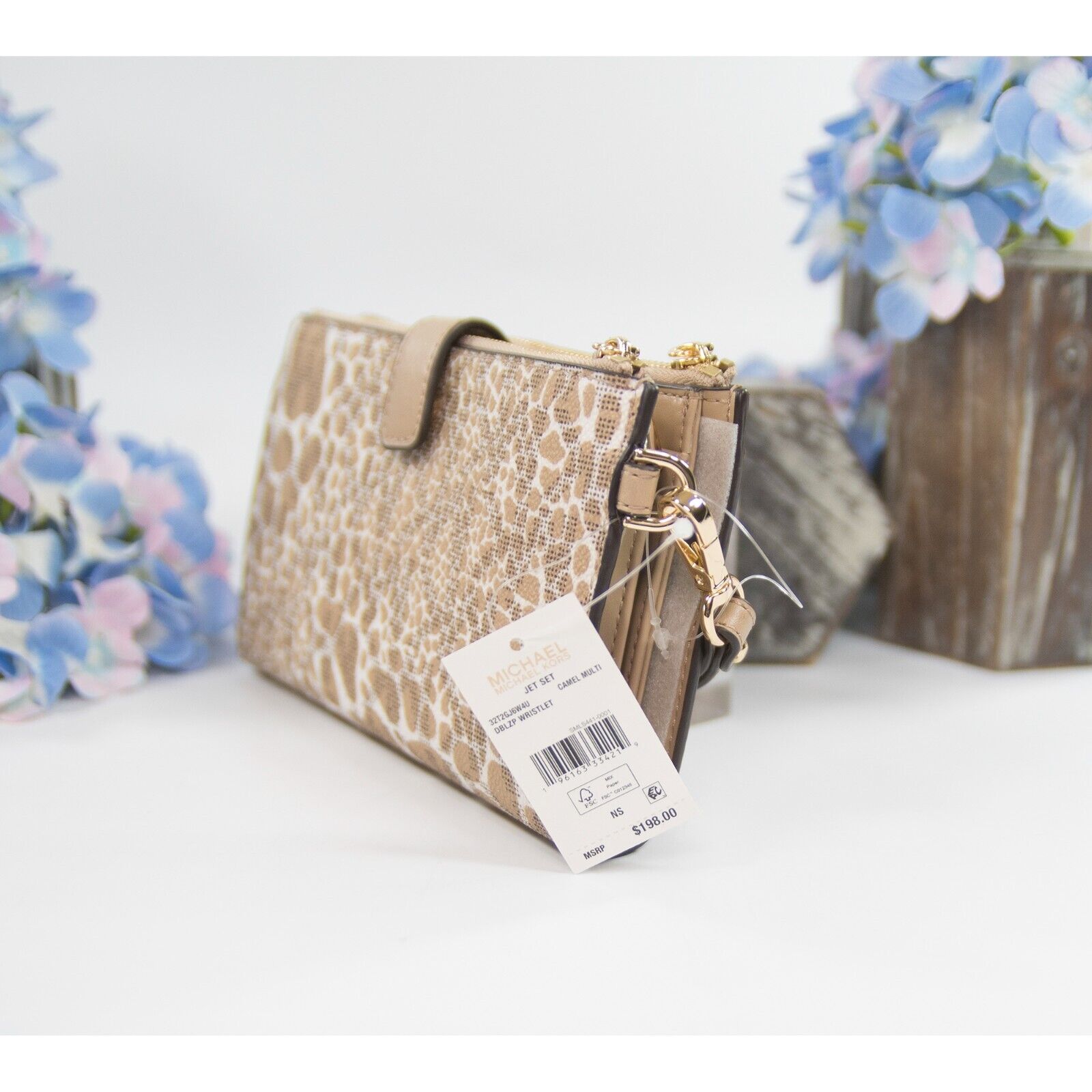 Michael Kors Jet Vanilla Monogram Camel Zebra Double Zip Phone Wallet NWT