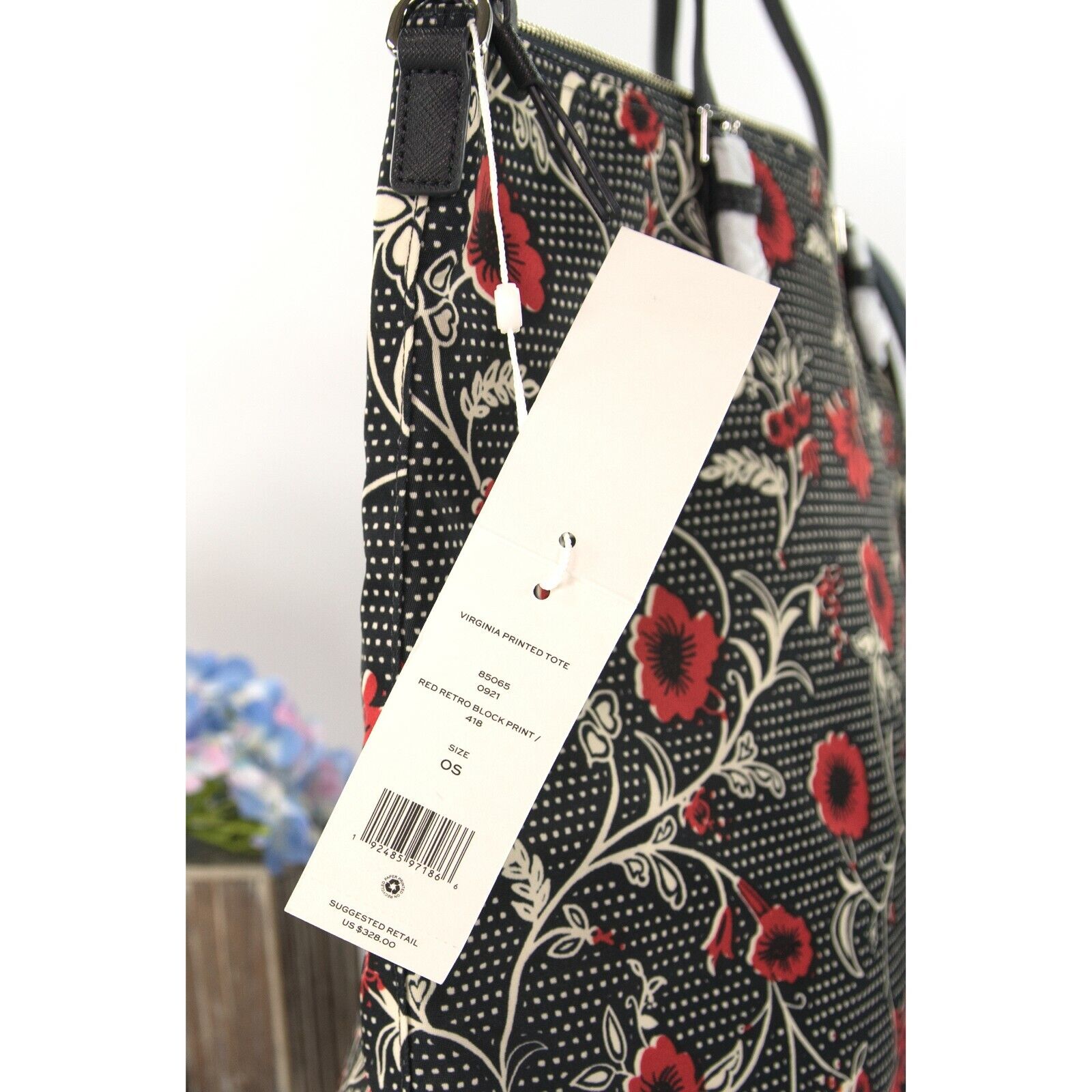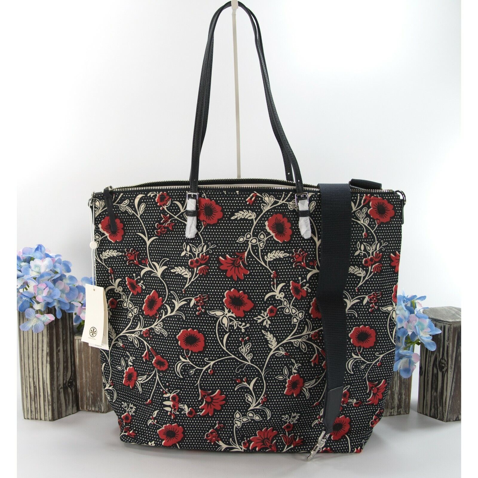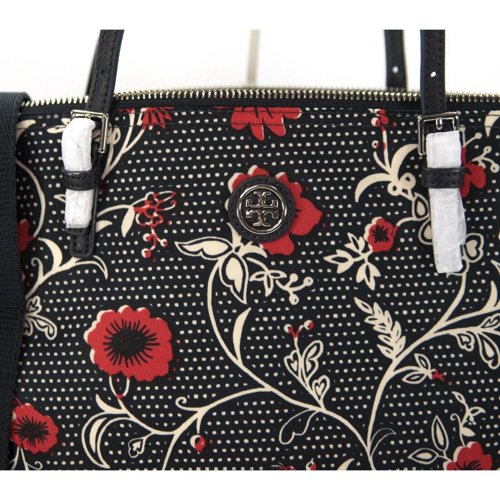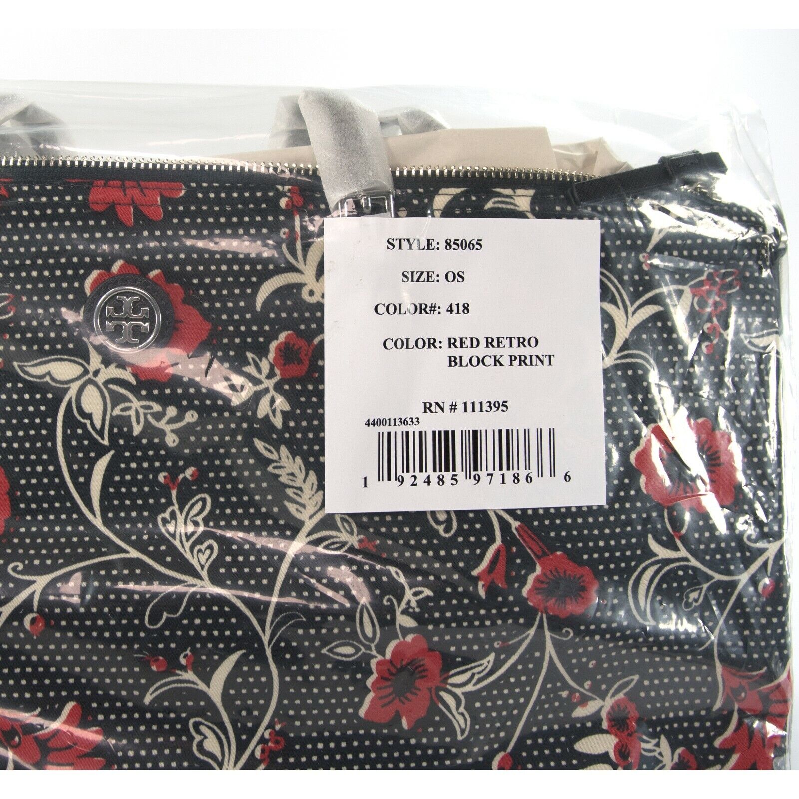 Tory Burch Virginia Red Retro Floral Block Print Nylon Leather Zip Tote Bag NWT